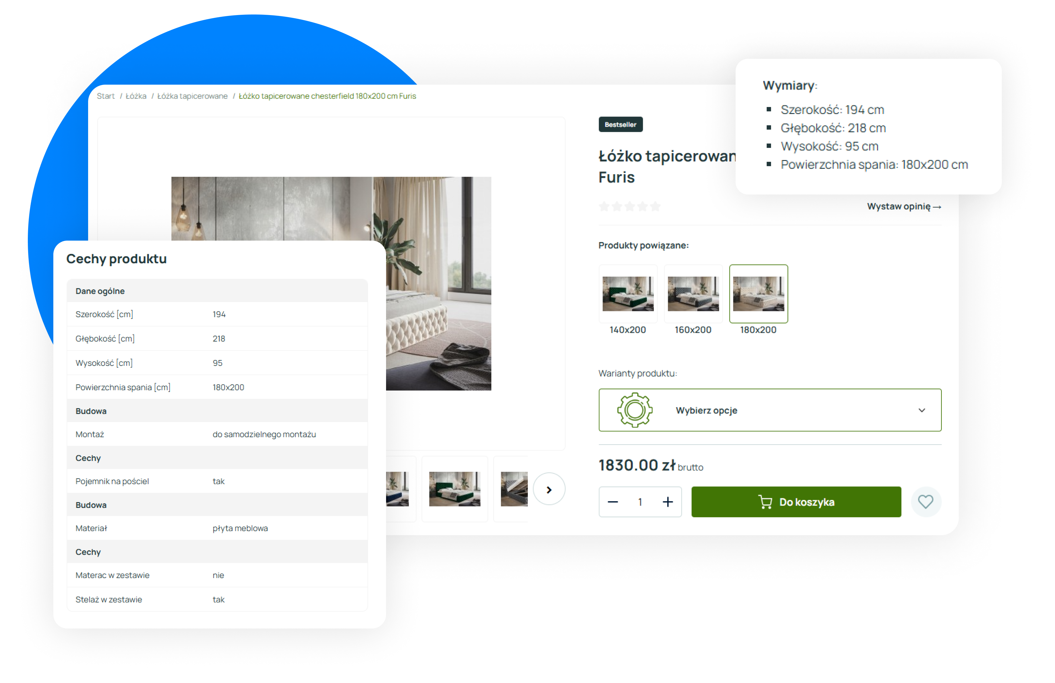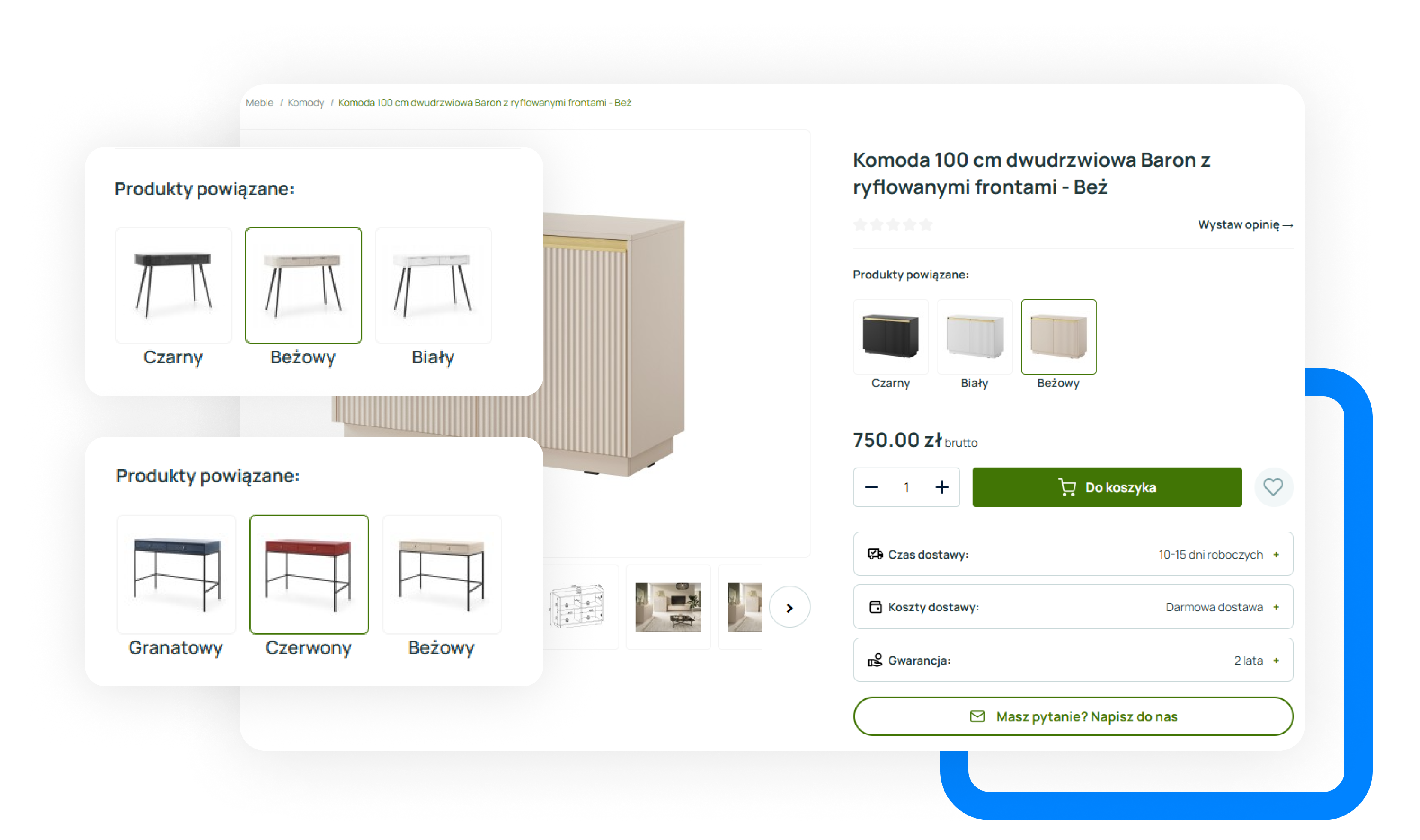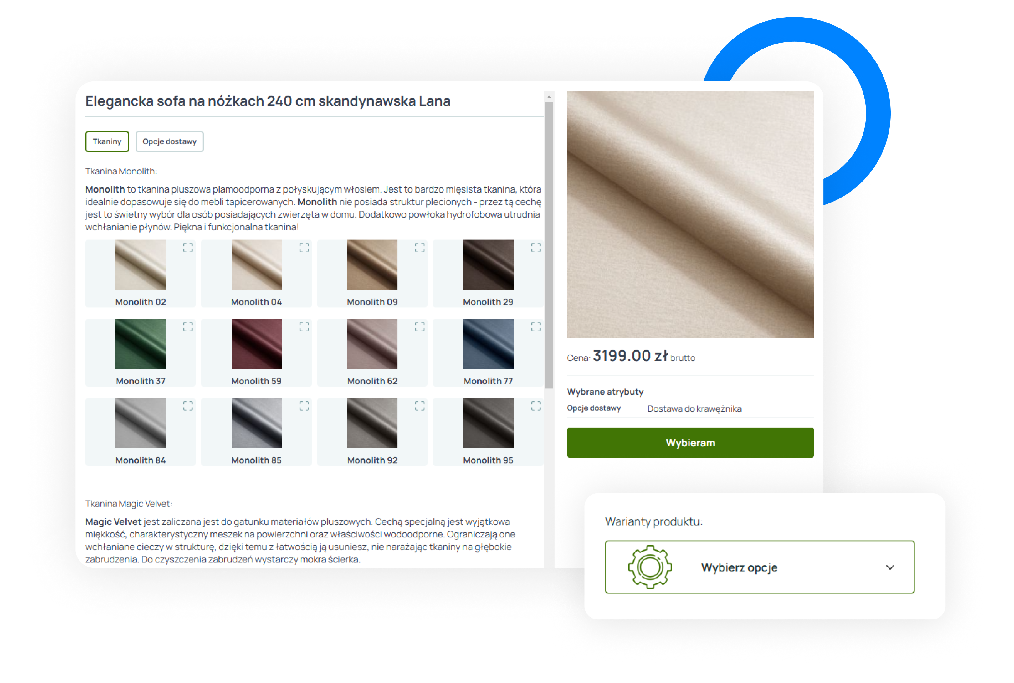 Na stronie dowolnego produktu możesz umieścić konfigurator, na którym klient wybierze dodatkowe opcje – na przykład kolor i rodzaj tkaniny, wykończenia i inne szczegóły dotyczące personalizacji mebli.