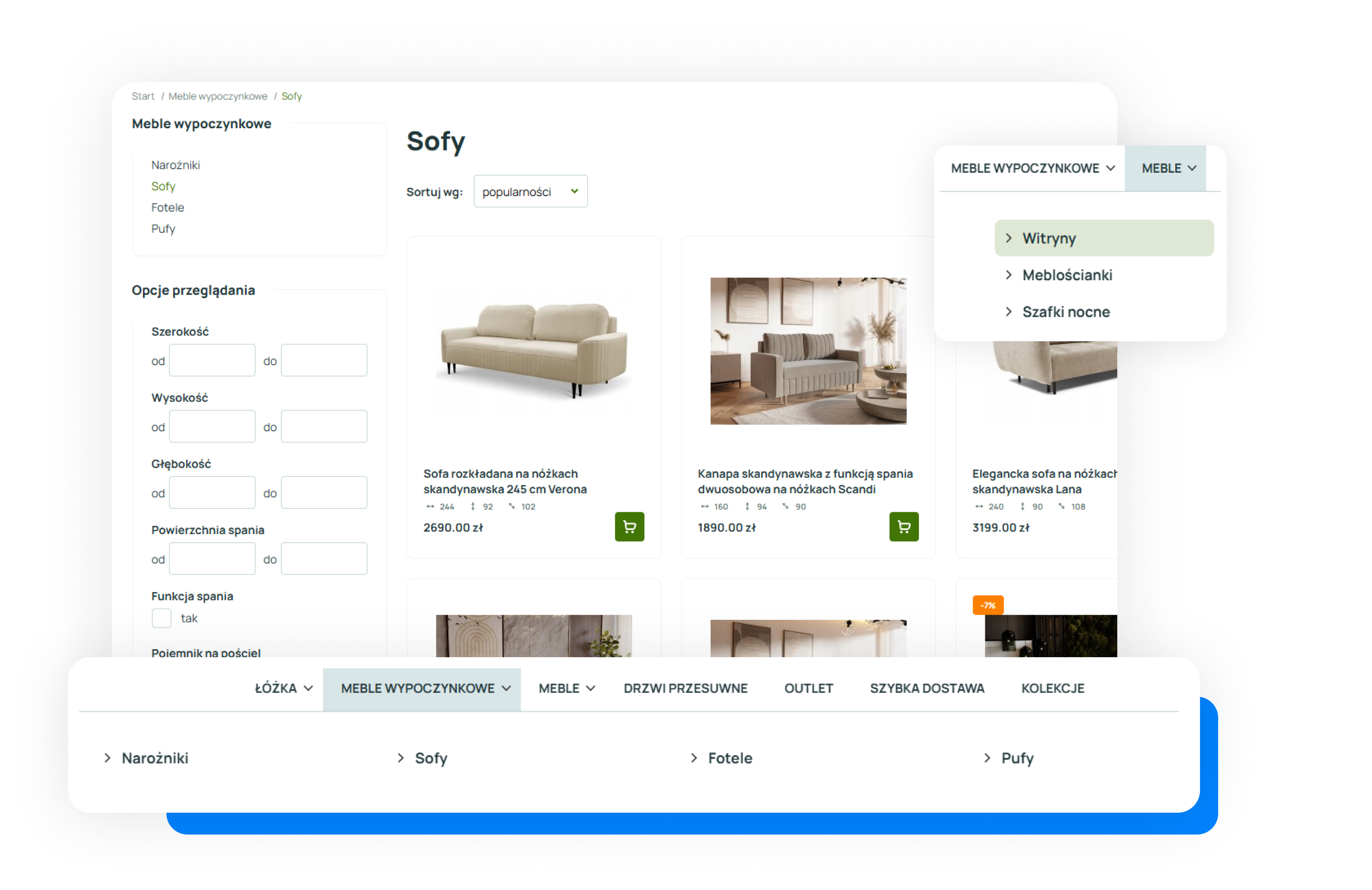 Produkty będą widoczne w wybranych przez Ciebie kategoriach w zależności od typu. Meble możesz pokazać klientom również w formie osobnej podstrony z wybraną kolekcją, by zaprezentować wszystkie produkty zaprojektowane w ramach jednego zestawu.